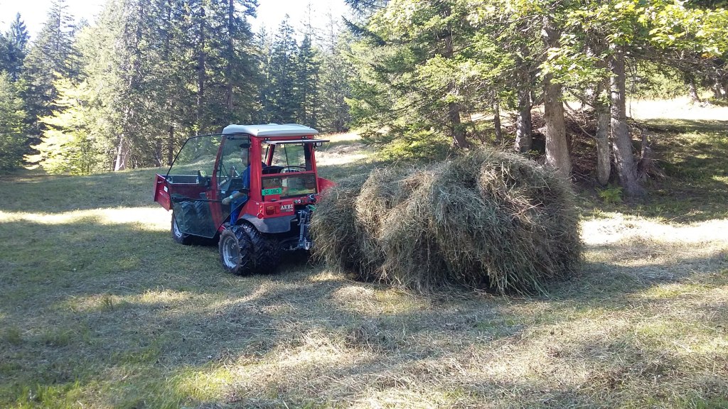 Weil der Boden für eine Transporterfahrt zu nass war, musste die Alpstreu mit dem alten Holzschlitten nach unten geführt werden.