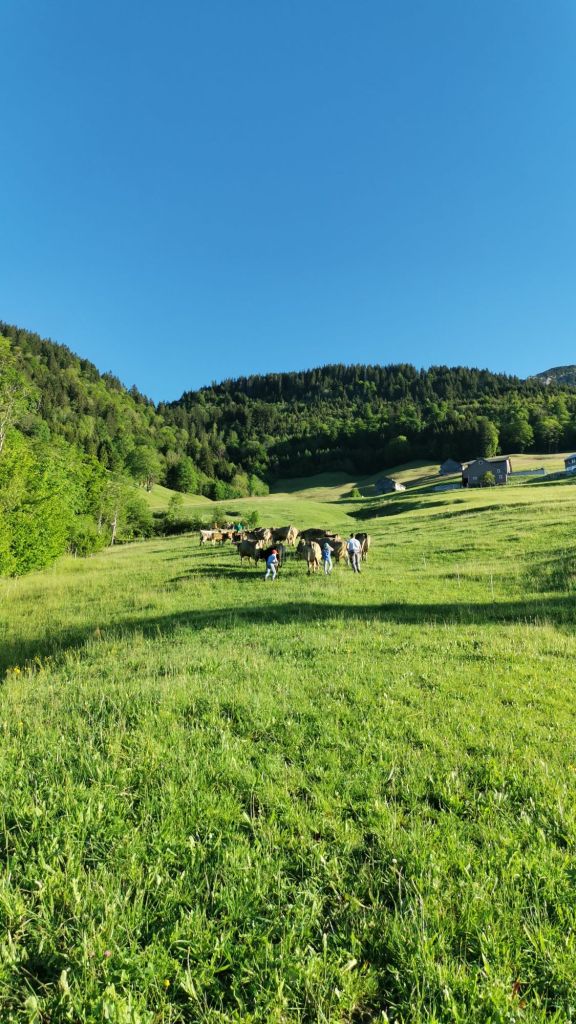 Zügig und ohne weitere Zwischenfälle kamen wir auf der Alp Hintermatt an. Die Kuhherde genoss das erste frische Alpengras während wir Helfer einen feinen Zmorgen zu uns nahmen.