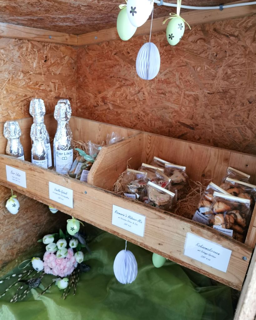 Die Boos-Bäuerinnen waren fleissig. Egal ob verschenken oder sich selber daran erfreuen, hauptsache lecker. In unserem Direktvermarktungs-Hüsli kannst du dich selbst bedienen. Verbunden mit einem Spazier-Rundgang durch den Ammler Hinterberg wird dein Oster-Einkauf zum Erlebnis.